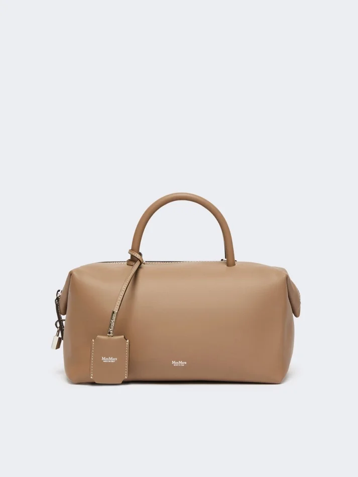 handbag with two handles and slightly folded sides. complete with removable shoulder strap for crossbody wear, custom key tag, leather feet and metal max mara lettering on the front.
