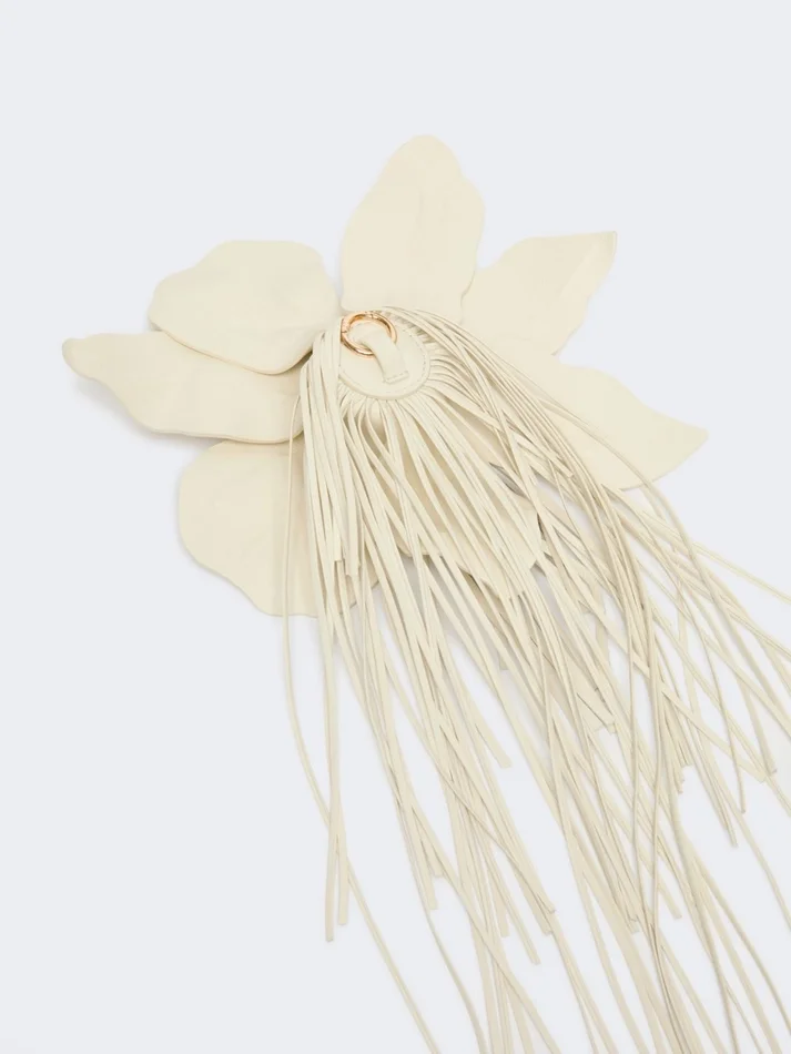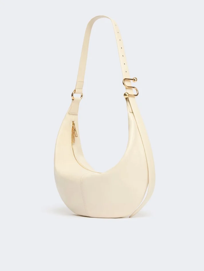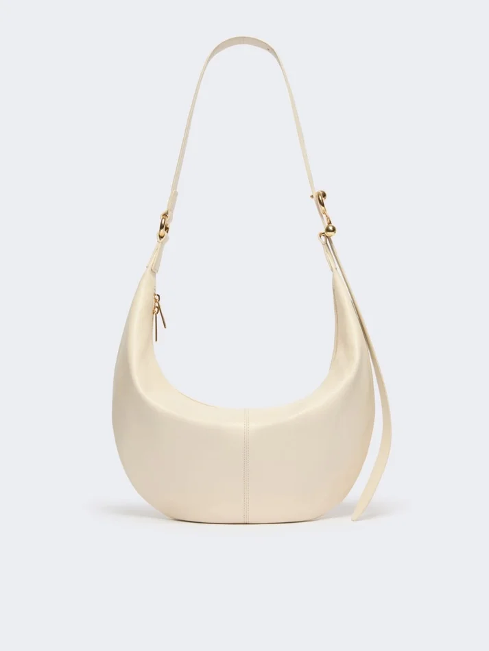half-moon hobo bag with soft nappa leather structure. the long adjustable shoulder strap is decorated with an s-shaped metal buckle. completed with a flower-shaped leather charm.