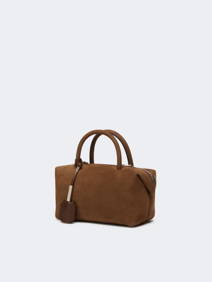 small boston handbag with double handle and m-shaped folded sides with magnet, lock and personalized leather key tag.