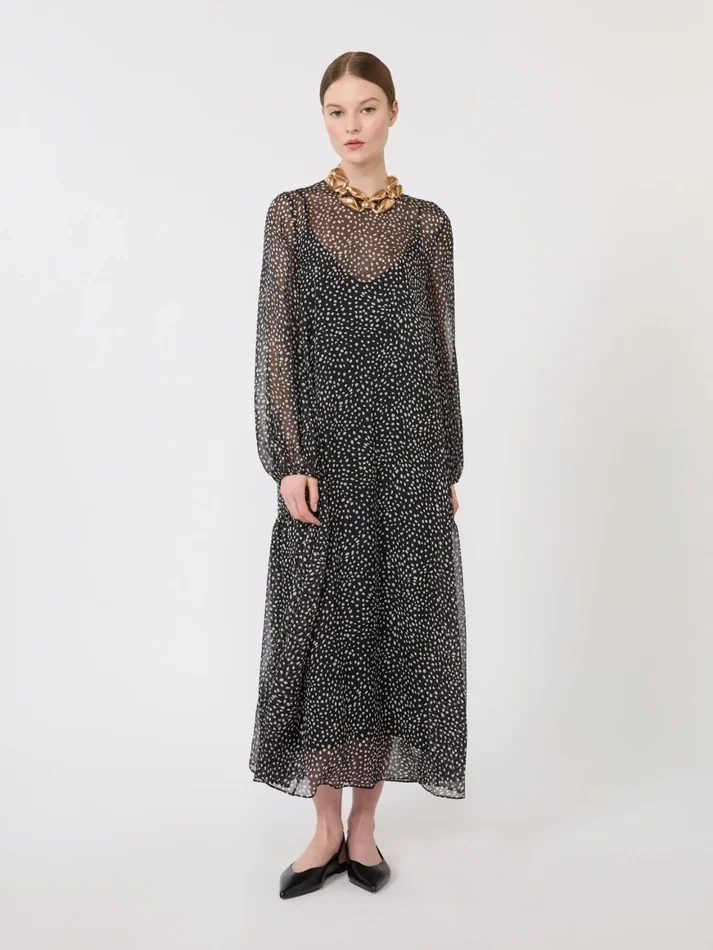 long dress with a flowing silhouette, featuring a collection pattern printed all over.