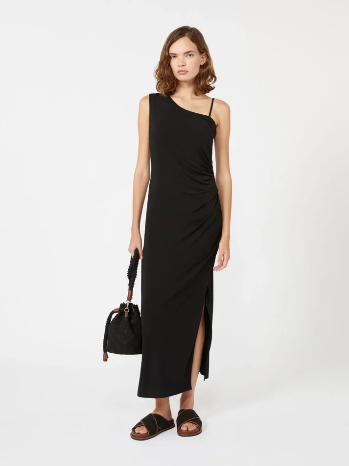 one-shoulder midi dress, with a fitted silhouette and a gathered pattern on the left side.