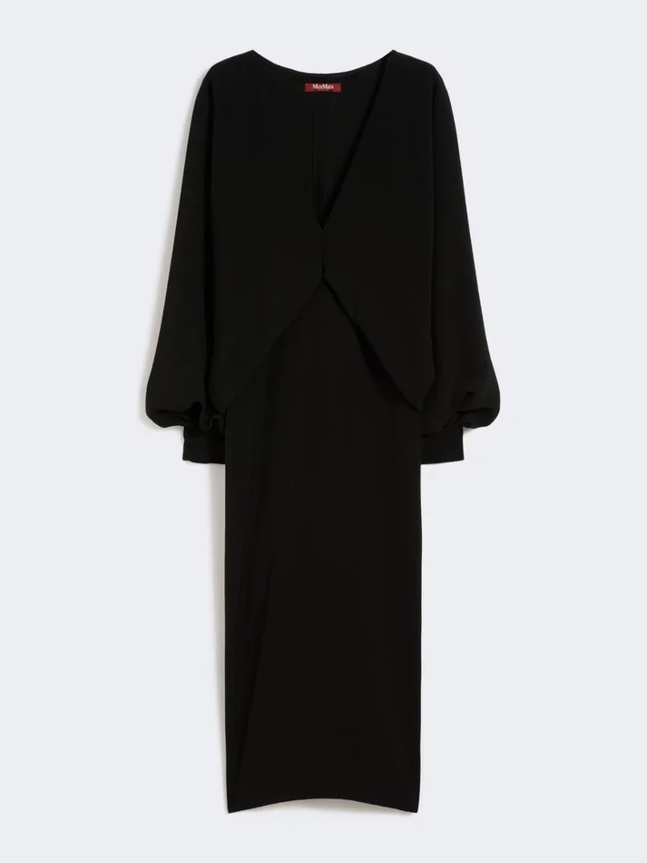 long dress featuring a slanted seam motif on the bodice and a flounce that falls with a blousy effect at the waist.
