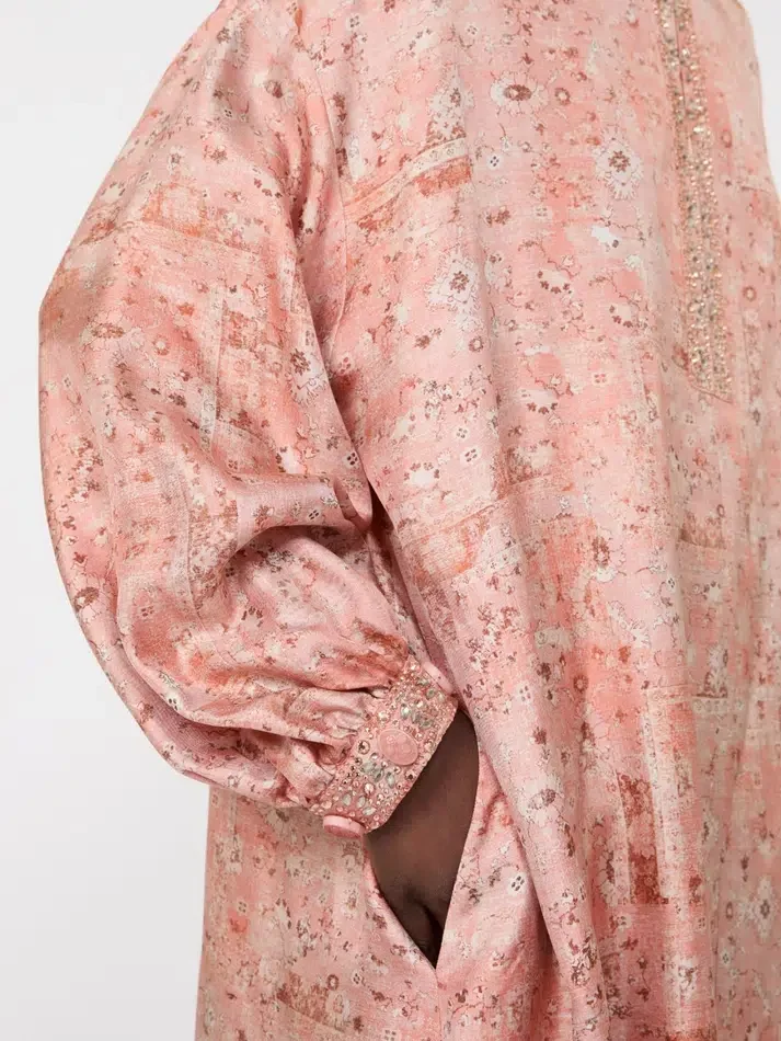 long kaftan dress featuring rhinestones and hand-sewn cameo-style stones embroidered on the cuffs and placket.