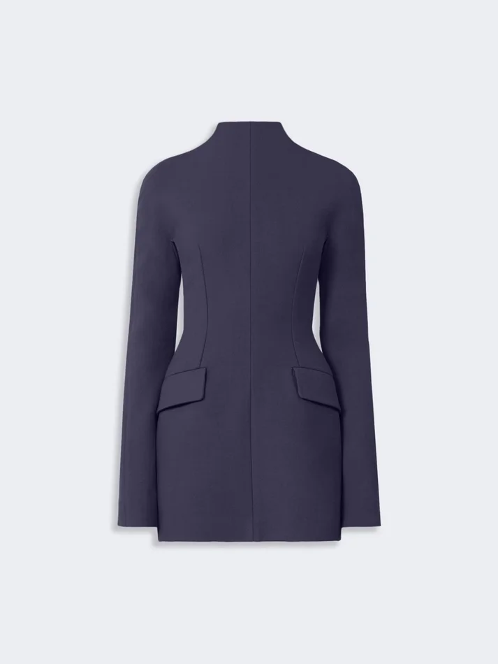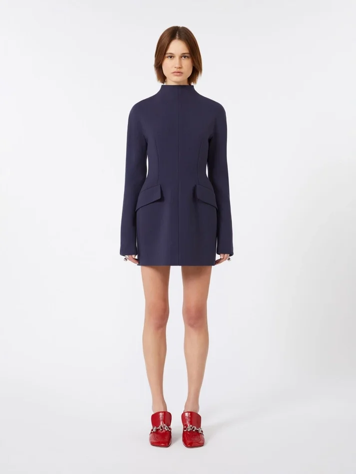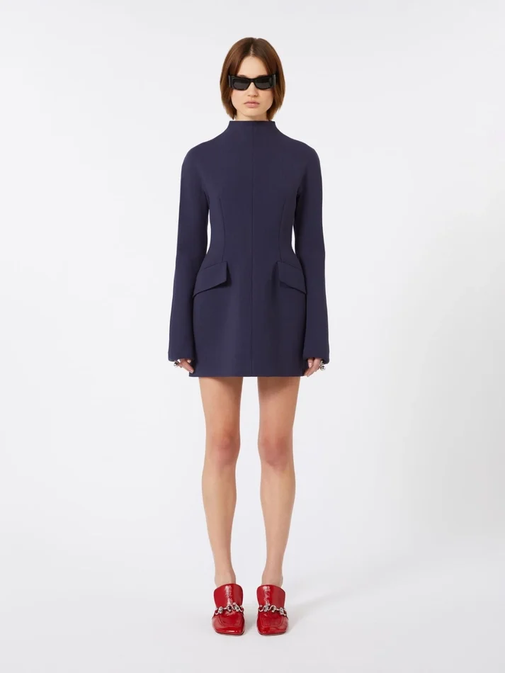 hourglass-shaped dress with a high neck and fitted waist. the deep darts and seams on the centre-front and centre-back create a rounded succession of feminine lines over the hips. – stretch tech double gabardine wool dress – hourglass line, fitted at the waist and rounded at the hips – stand collar with centre back zip and kimono-cut sleeves – deep darts at front and back – side pockets with flaps – fitted waist