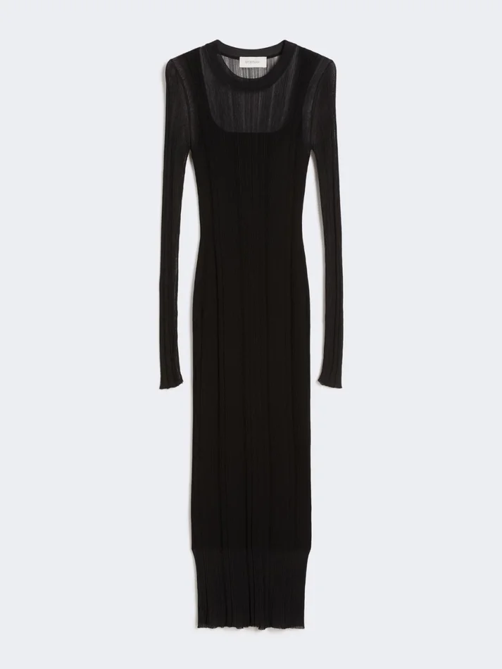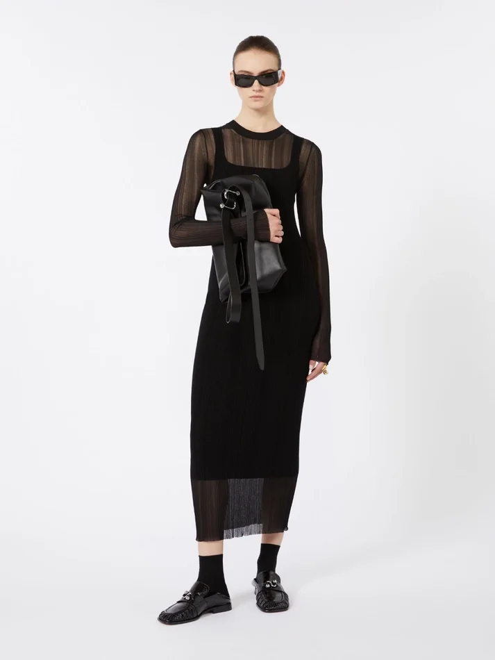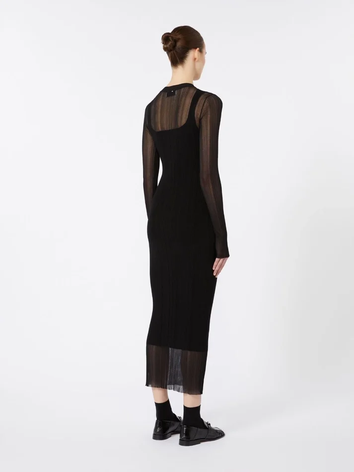 dress in stretch viscose knit featuring a special semi-sheer and opaque texture for a trompe-l’œil effect. short sleeves and a fitted cut enhance the silhouette.