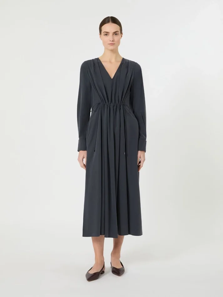 long dress featuring silhouette-accentuating adjustable drawstring detail on the front and back of the waist.