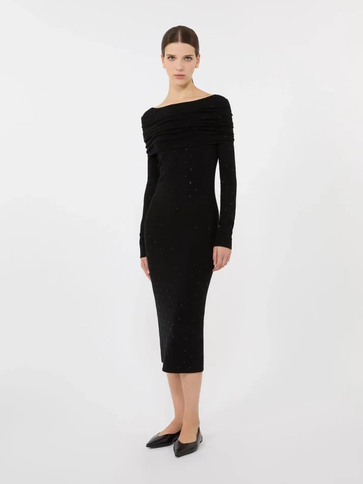 midi dress in a fabric-stitch knit, embellished all over with rhinestone embroidery.
