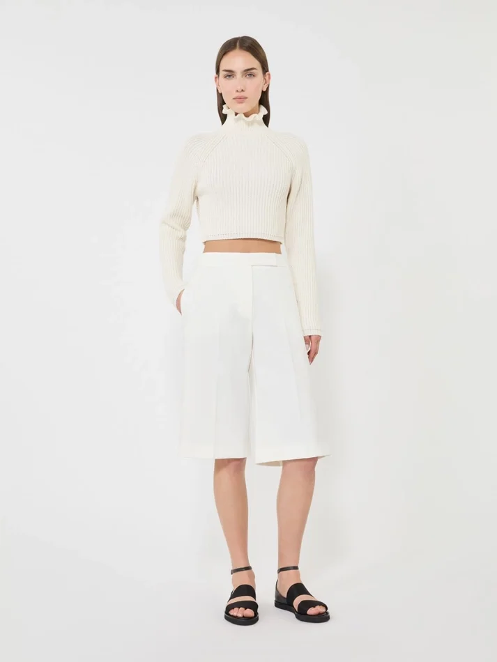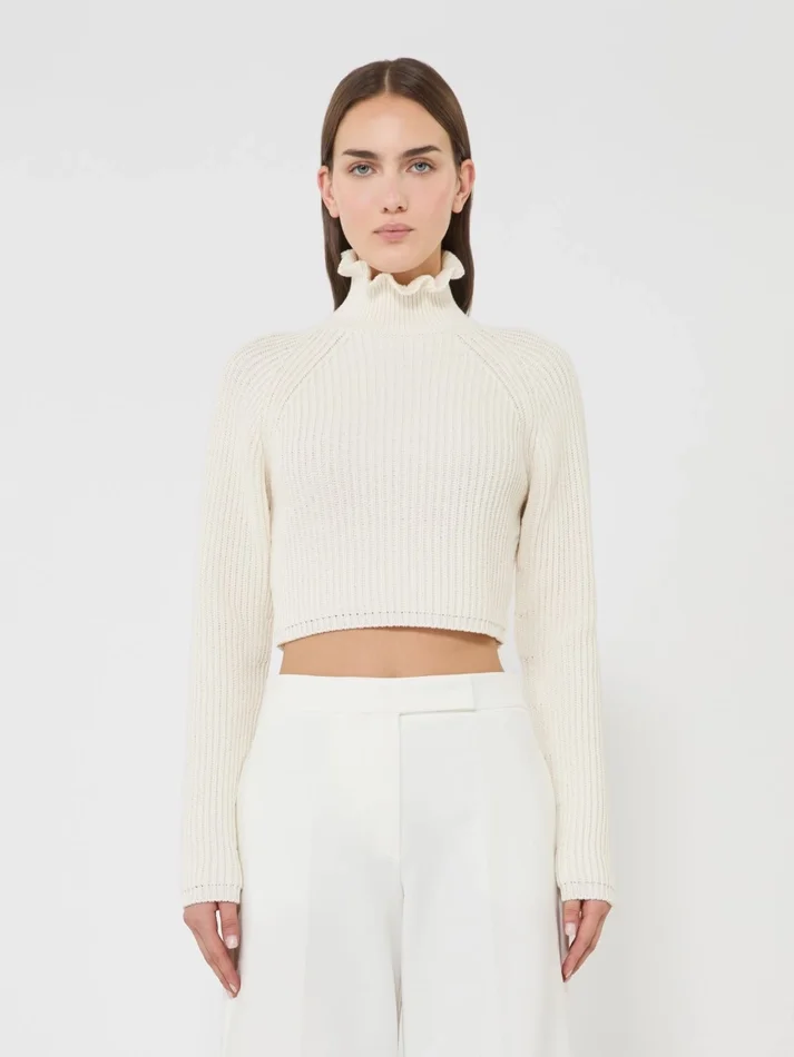 cropped jumper, featuring a loose high neck that creates a flounce motif.