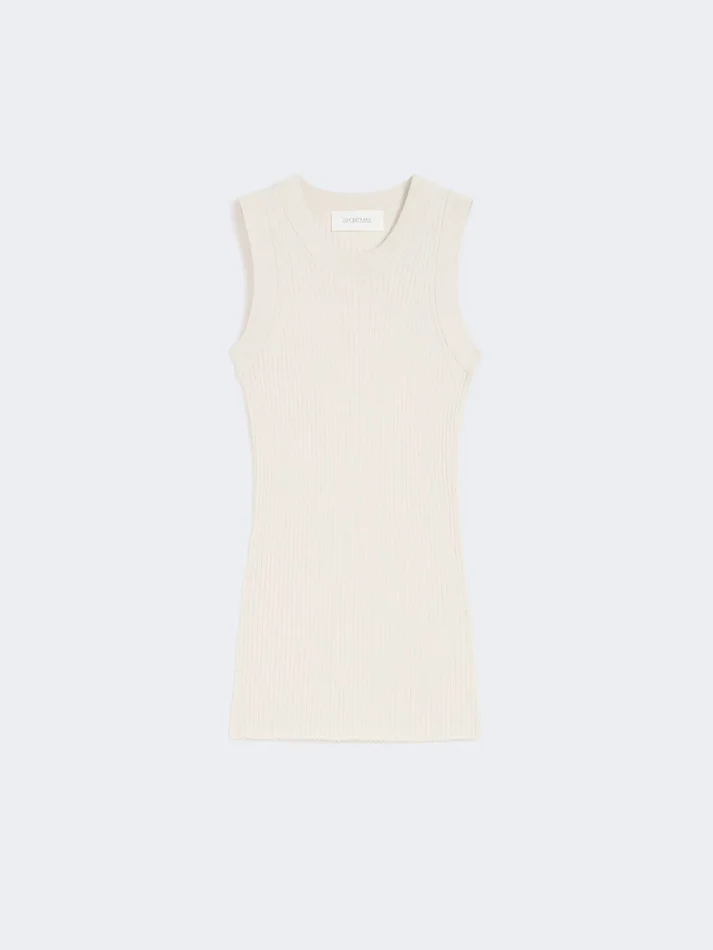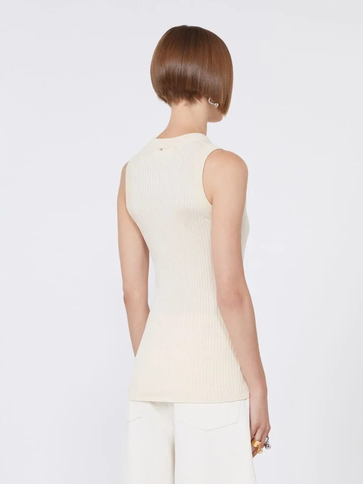 rib-knit pure cotton tank top with a drop-stitching motif along the neck and armholes. the naturally snug-fitting piece is embellished with narrow ribbing on the neckline and armholes.