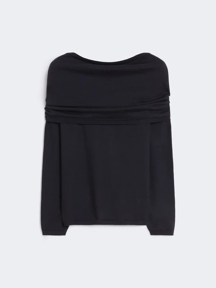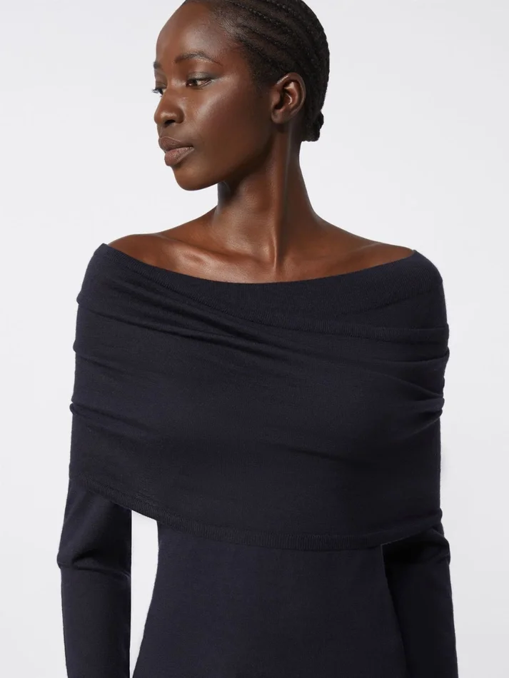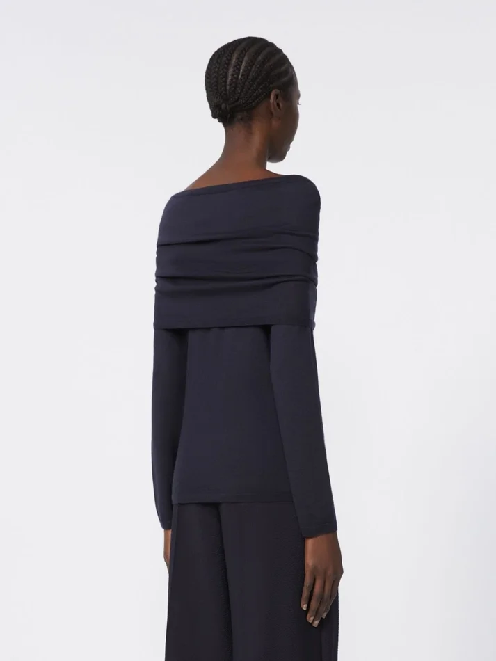 seamless sweater with removable matching-fabric wrap detail that rests on the shoulders.