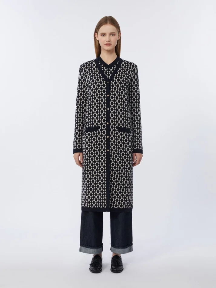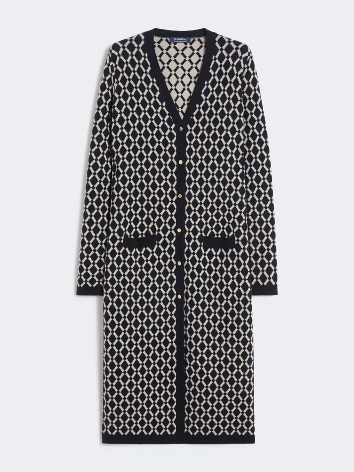 long cardigan featuring an all-over jacquard-knit geometric pattern.