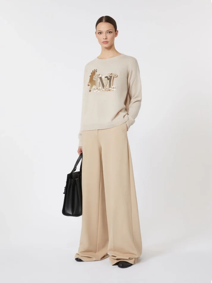 the front of this iconic max mara sweater is customised with sequin and rhinestone-embroidered m monogram detail.