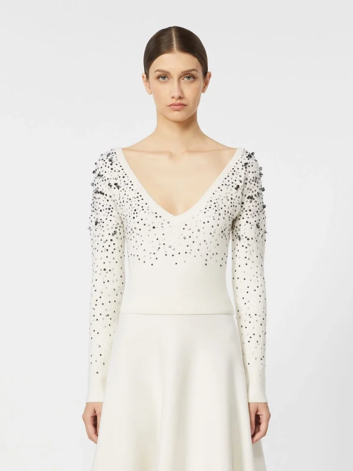 feminine sweater featuring hand-embroidered wet-look sequin detail.
