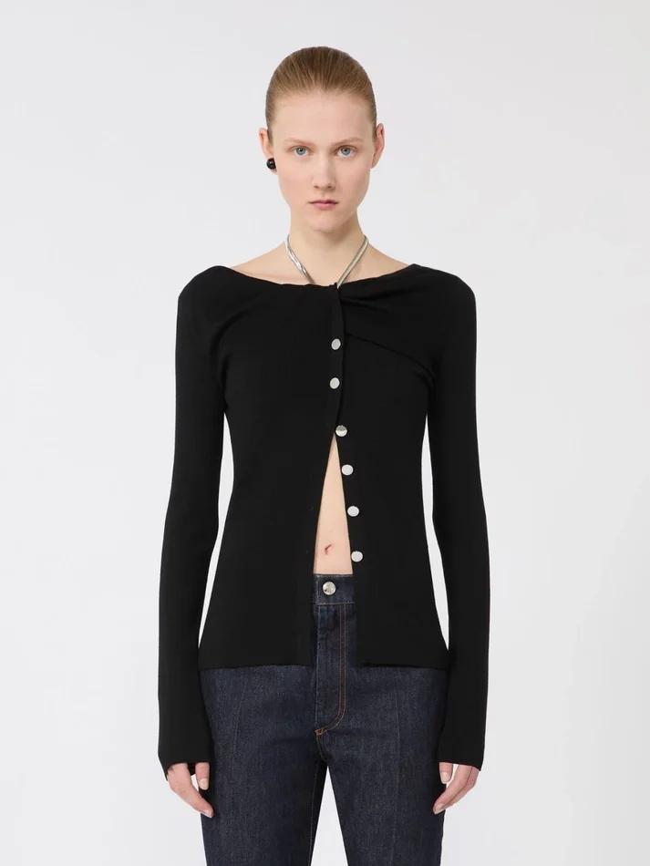 new jumper, streamlined on the body, with rounded neckline and metal chain detail on the front neckline. cardigan-style buttoning that opens from the bust down.