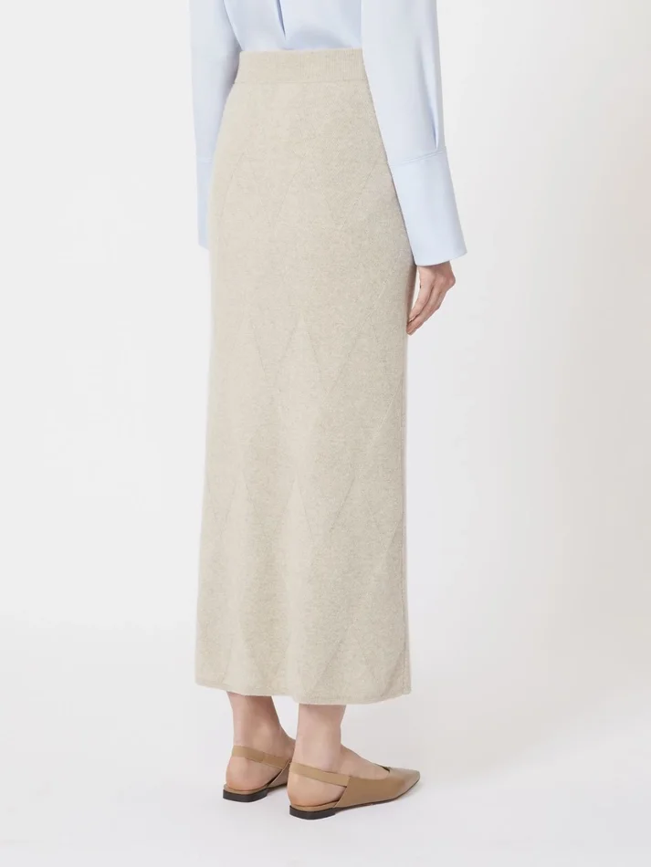long pencil skirt in a fisherman’s rib knit finished with an argyle motif.