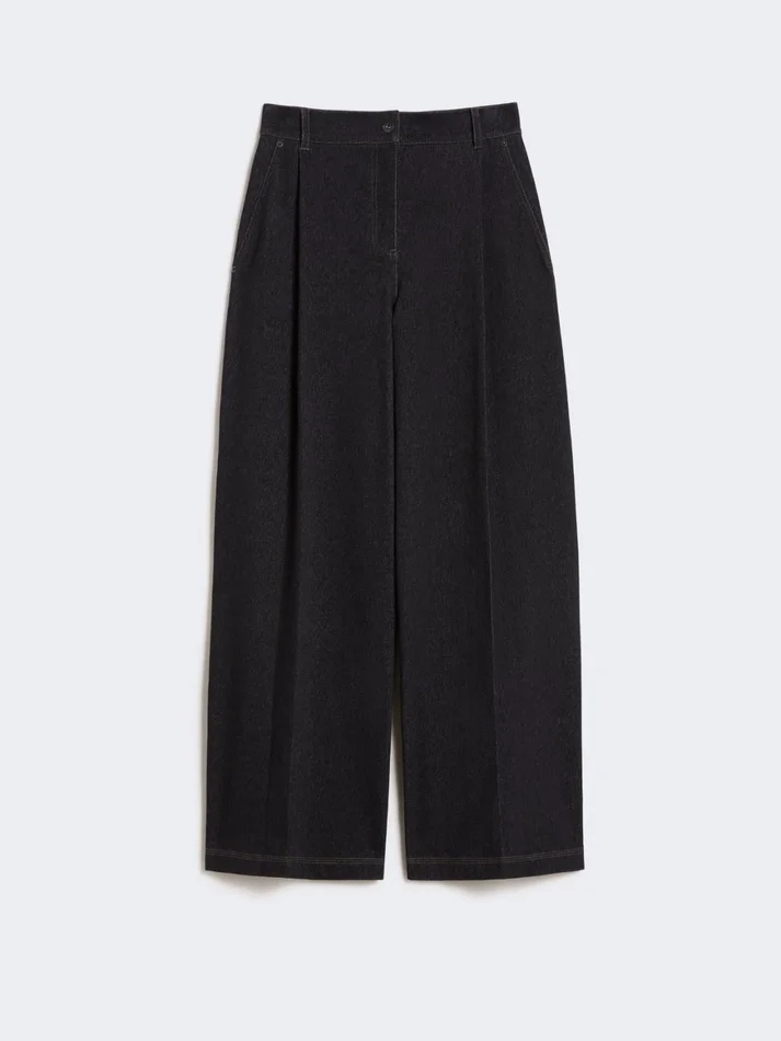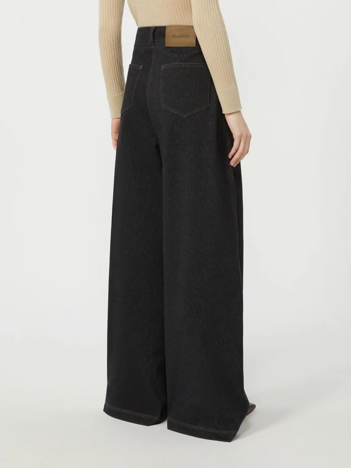 wide trousers featuring iconic denim-style details: vintage-effect plated metal rivets and tan-coloured stitching.