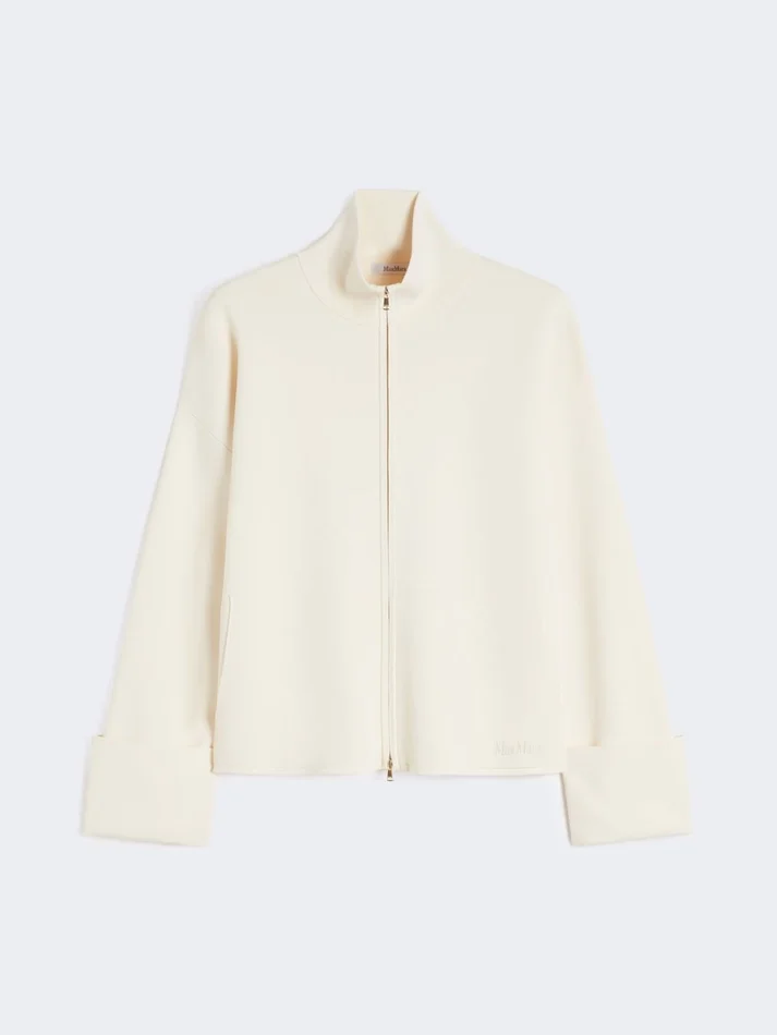 boxy cardigan featuring a high neck and wide cuffs with gold-coloured ball button.