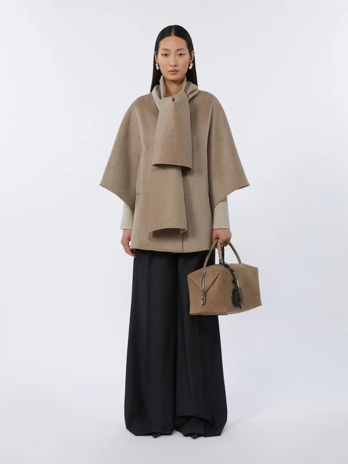 single-breasted cape with a loose, enveloping design and a matching removable scarf.