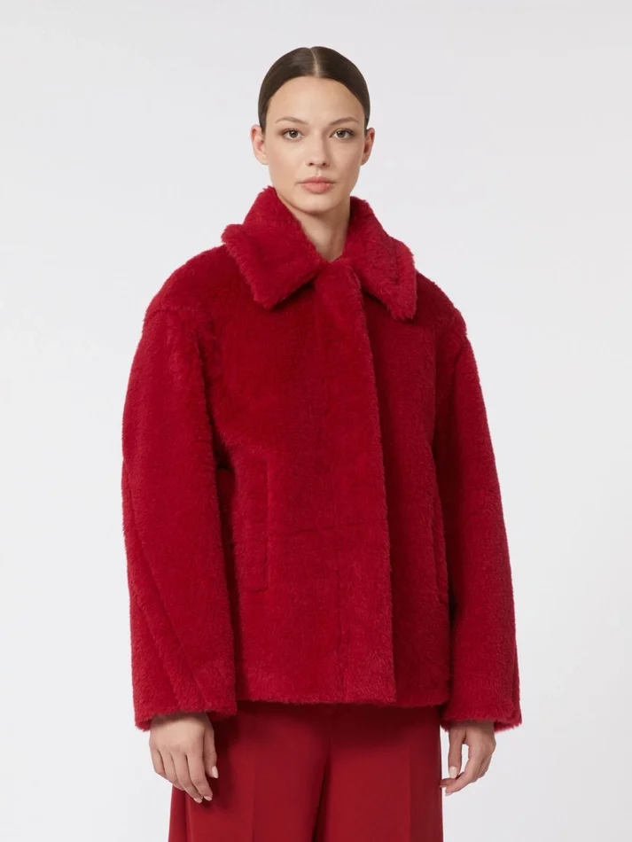 jersey fabric 62% alpaca, 26% virgin wool, 12% silk; lining 98% cupro, 1% viscose, 1% metallised fiber.