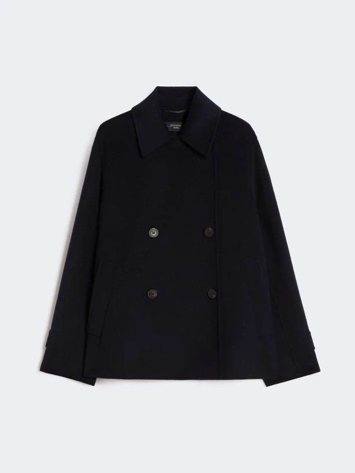 short, double-breasted pea coat.