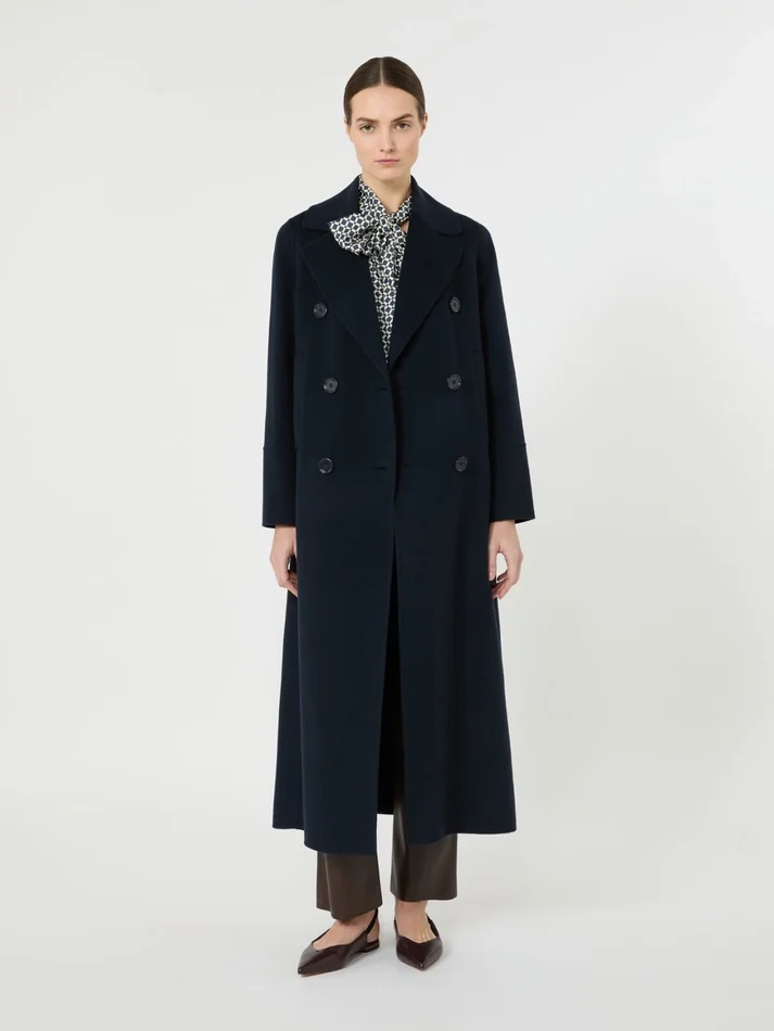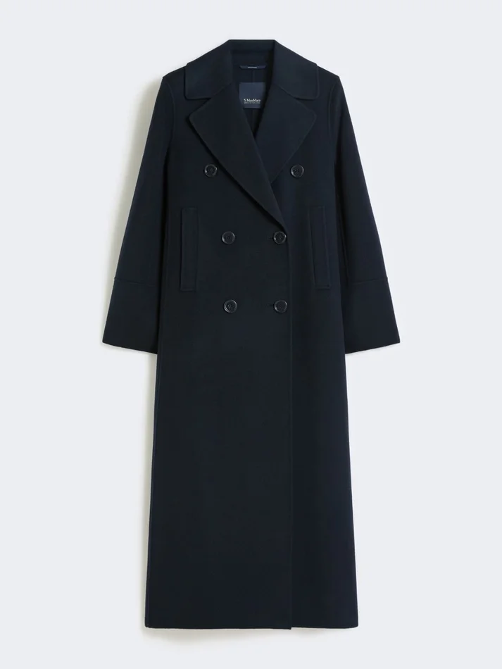 long double-breasted coat featuring button-adjustable half-belt detail at the back of the waist.