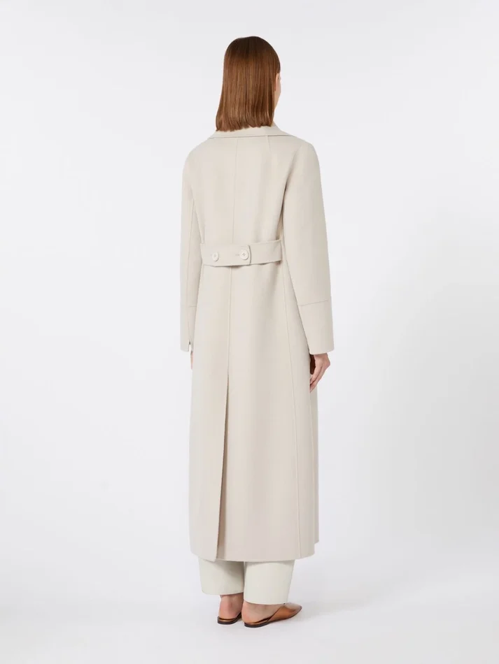 long double-breasted coat featuring button-adjustable half-belt detail at the back of the waist.