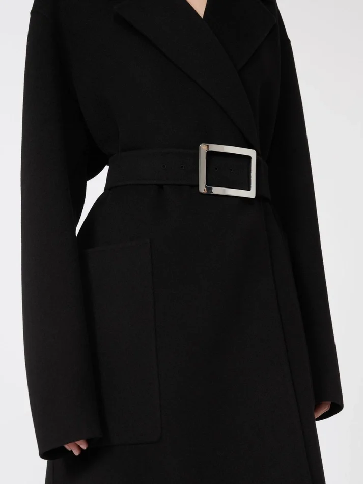 long wrap coat, crafted in soft double-face pure wool. the wide lapel and the belt at the waist with metal buckle highlight the feminine look, which is completed by maxi patch pockets for touch of functionality.