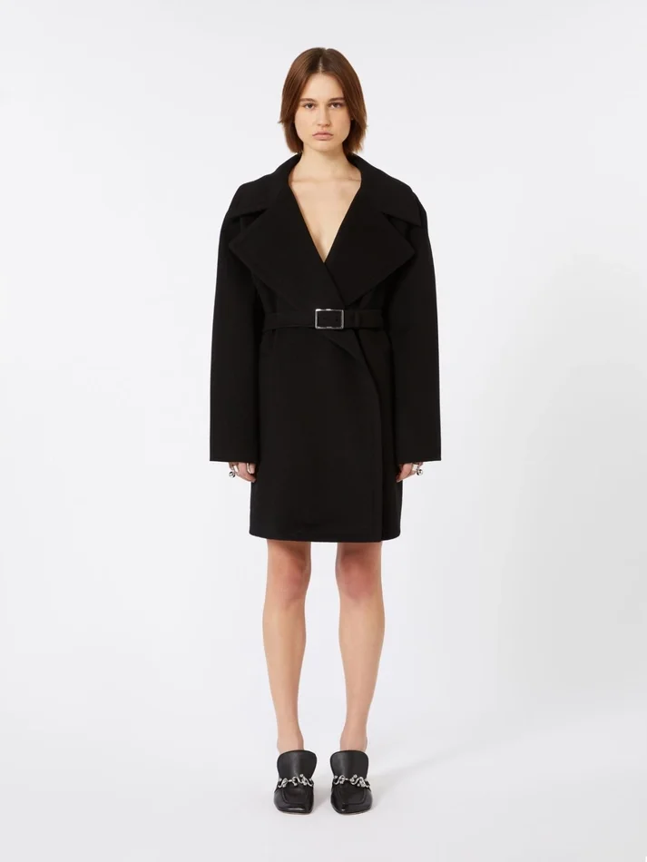 coat with wide lapels, crafted from soft pure wool double drap. short design, cinched at the waist with a belt for a customizable silhouette.