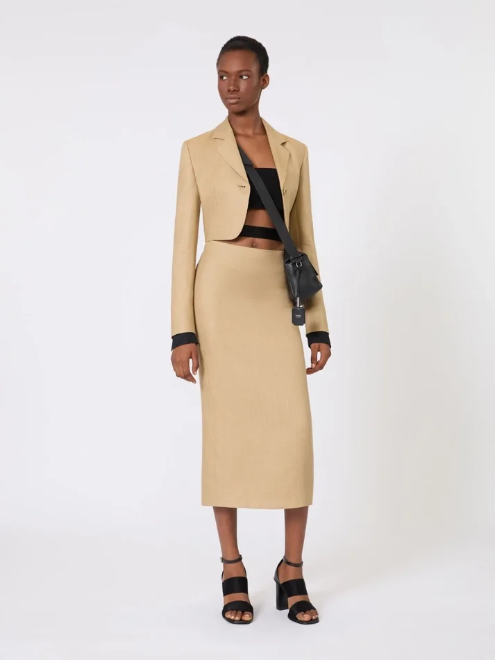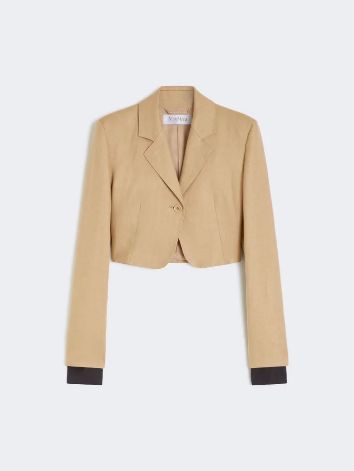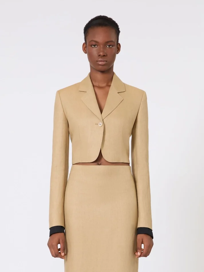 single-breasted jacket, featuring a fitted silhouette with a cropped waist and stitched pleats on the front.
