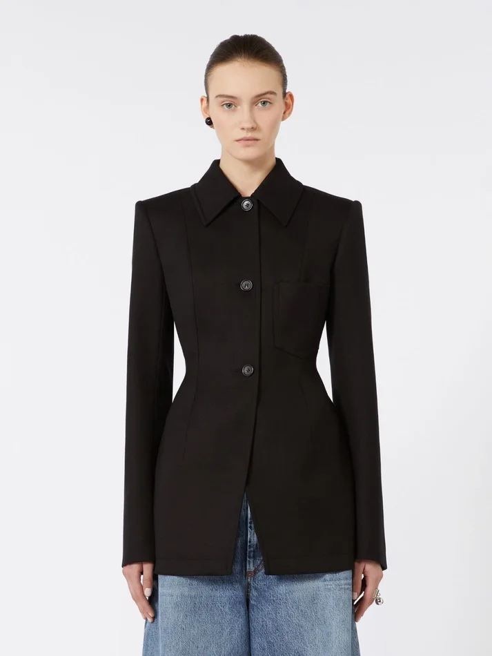 hourglass-shaped shirt jacket, fitted at the waist, accentuated by vertical seams on the bodice and a fixed martingale on the back. the silhouette is accentuated by the cut-away line to the hem.