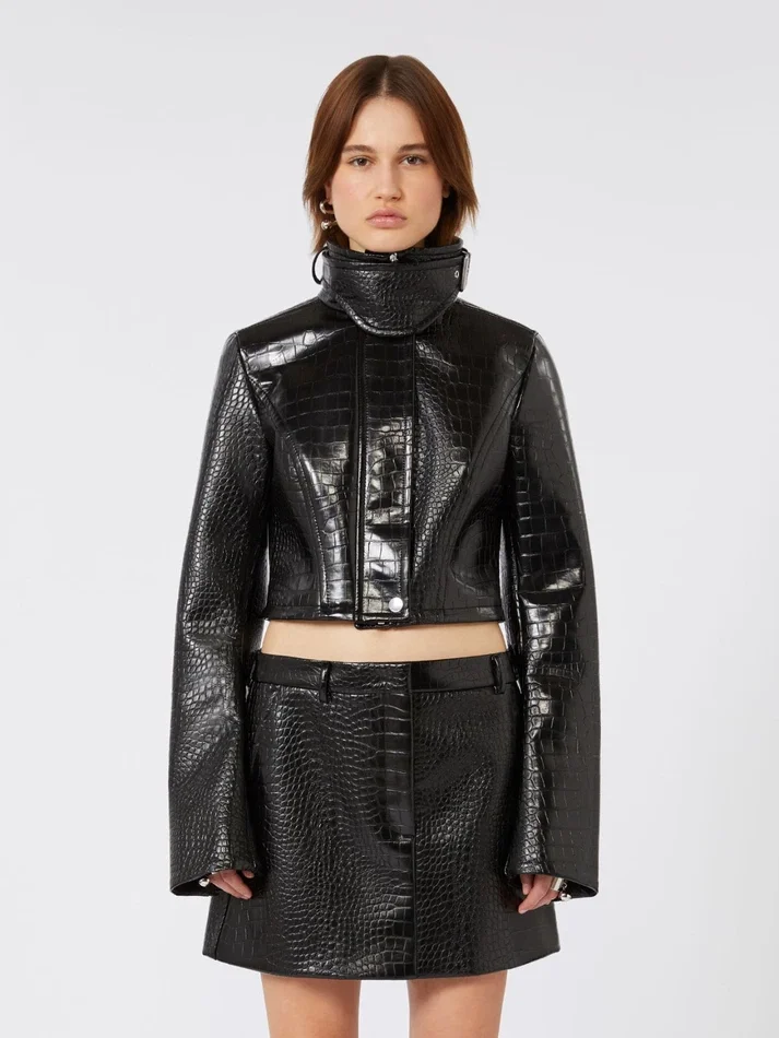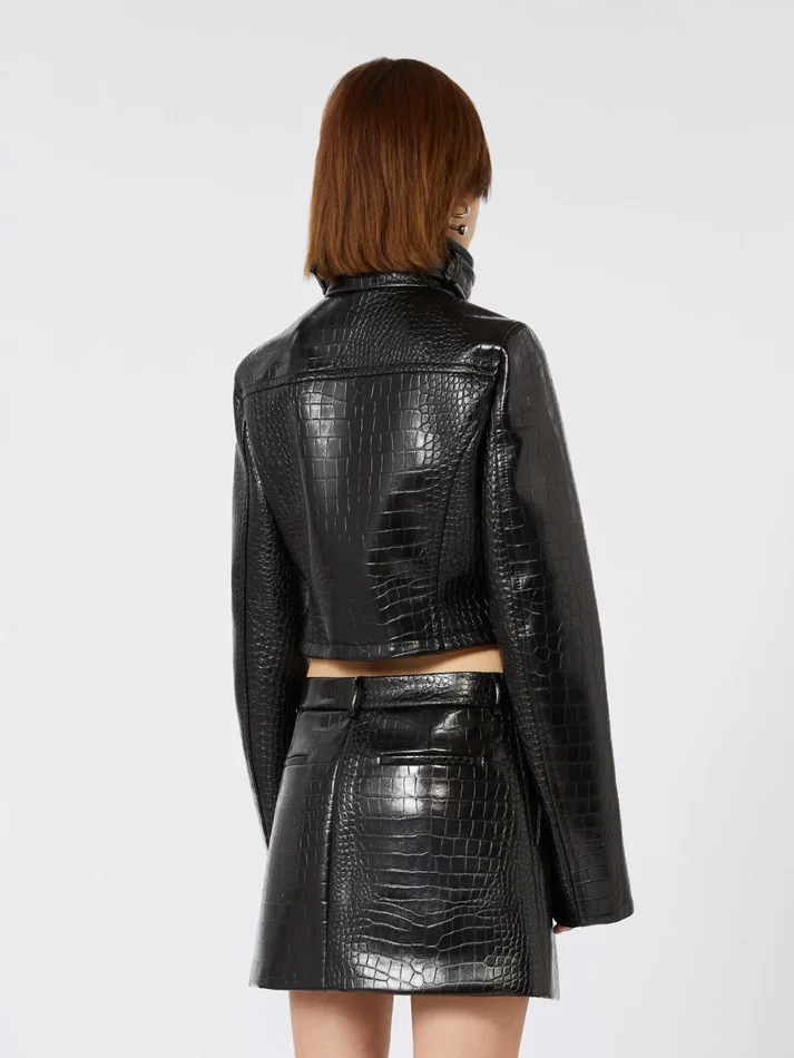 Patent leather cropped jacket with alligator print, black