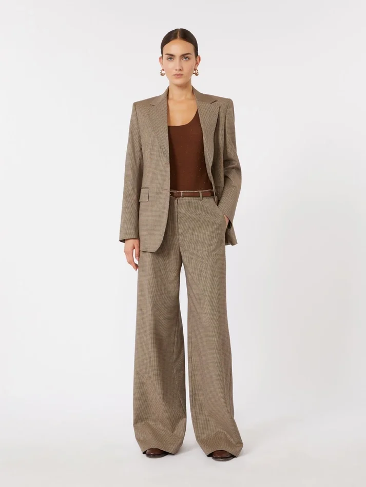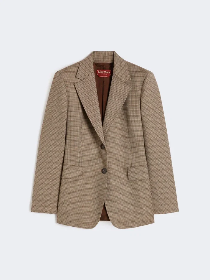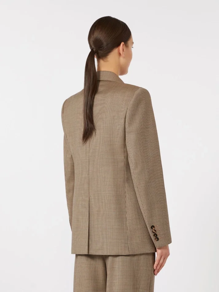 single-breasted blazer proposed in a masculine-inspired pattern.