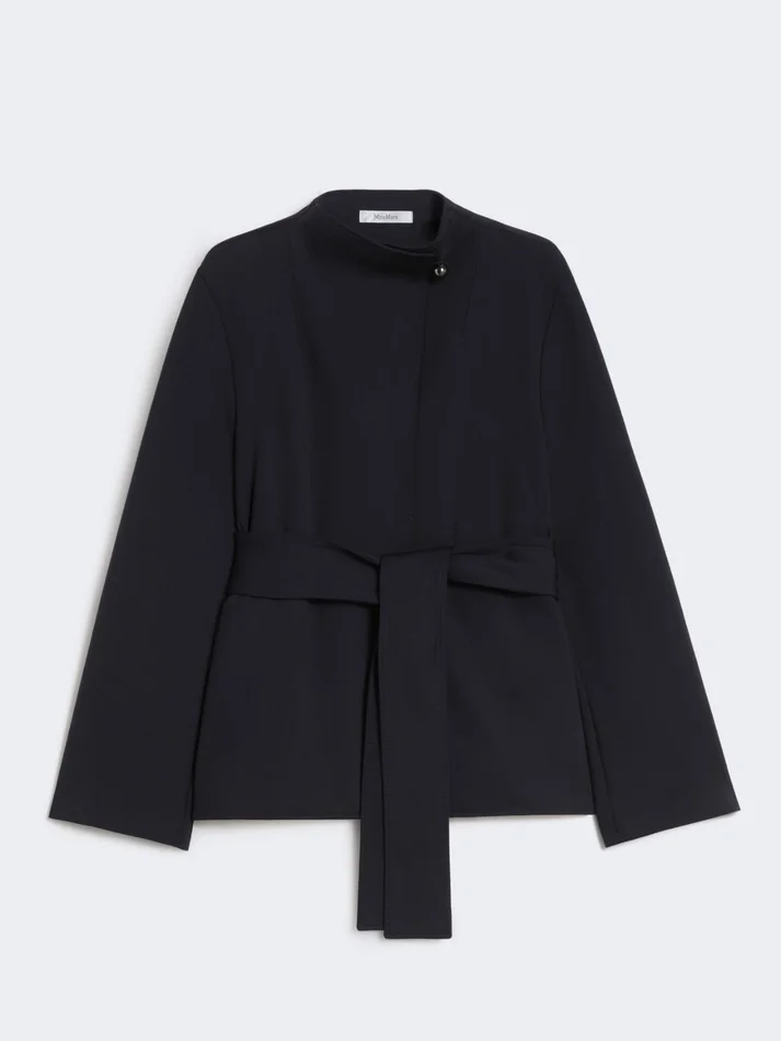 wrap jacket featuring a crater collar with front pleats sewn on the shoulders.