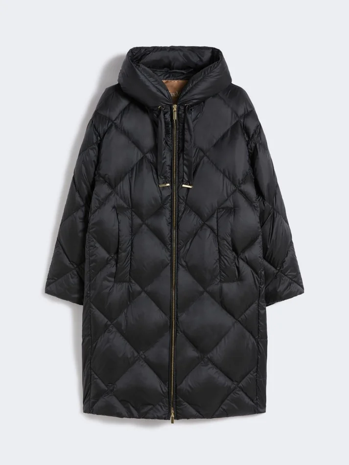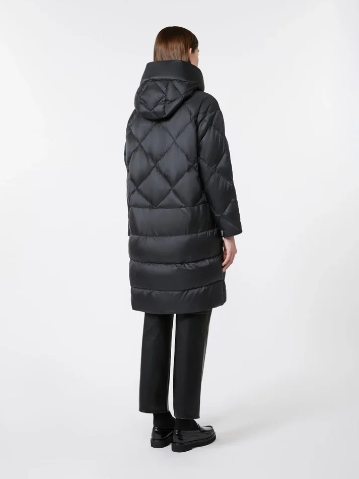 straight midi down jacket featuring an all-over quilted diamond pattern with horizontal stripe detail at the back hem.