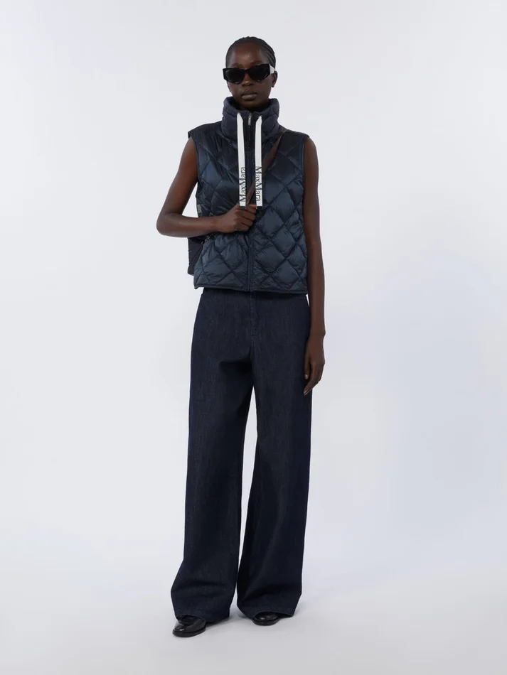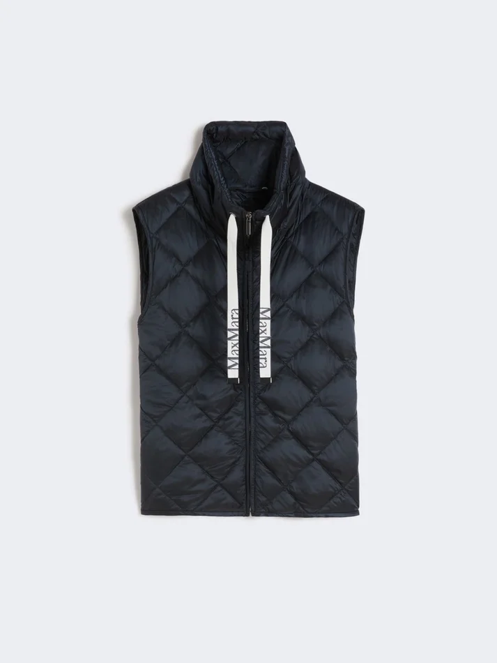 diamond-quilted gilet with high drawstring collar with jacquard logo-branded ribbons.