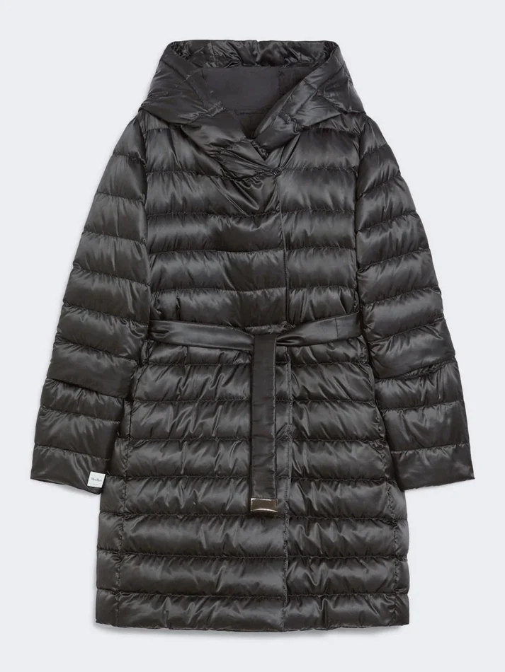 reversible midi down jacket with hood. supplied with two belts: one in a matching fabric, the other in technical webbing and leather.