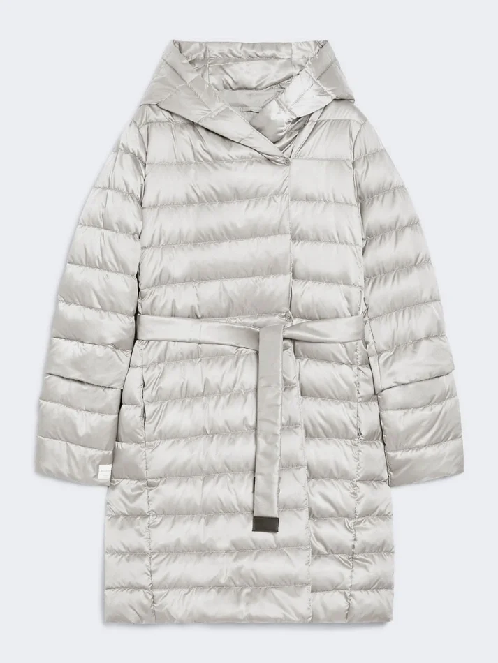 reversible midi down jacket with hood. supplied with two belts: one in a matching fabric, the other in technical webbing and leather.