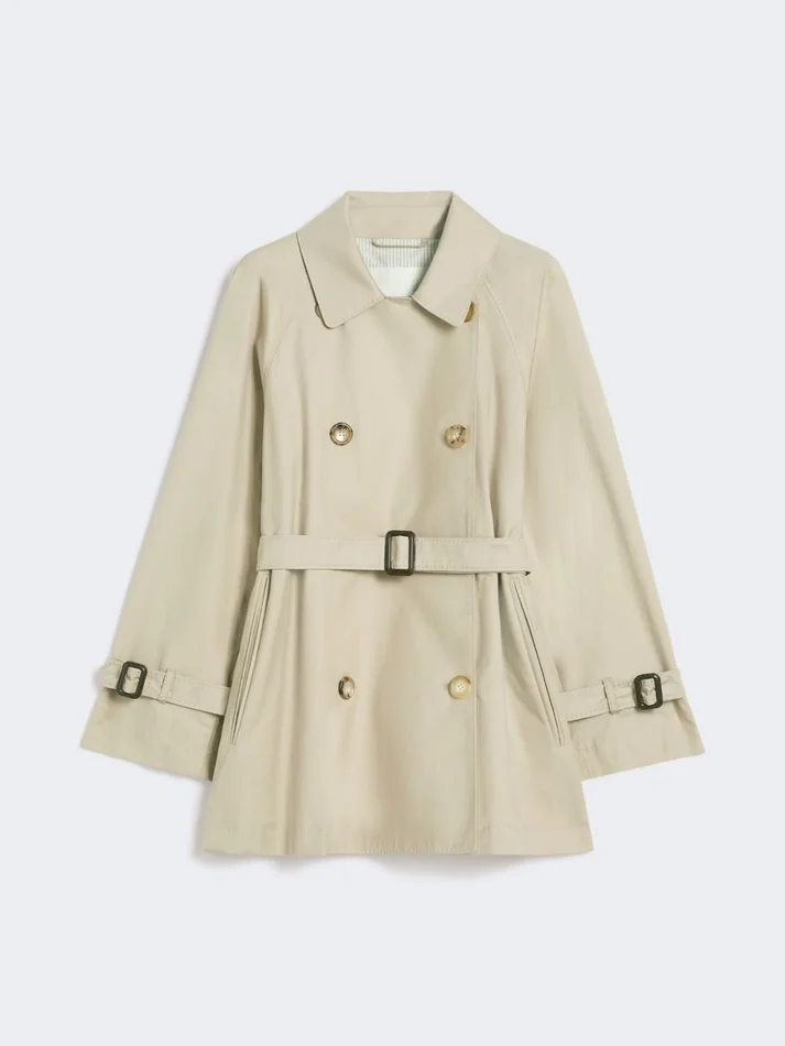 short double-breasted trench coat with rear rain cape, tailored stitching and matching belt with leather buckle and embossed max mara logo.