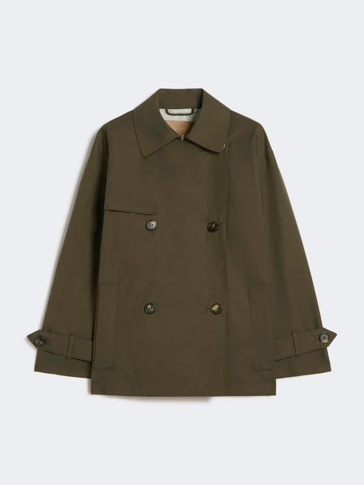 short double-breasted trench coat with shirt collar, rear rain cape and asymmetric detached yoke on the front right side.