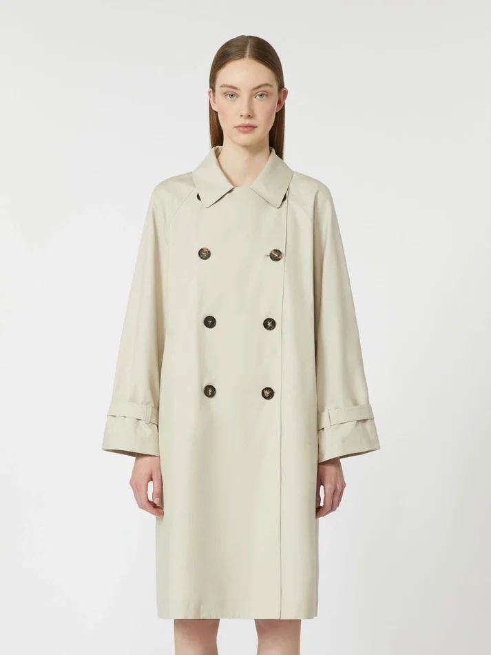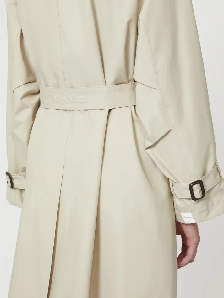 midi-length double-breasted trench coat with tailored stitching, matching customised belt and leather buckle.