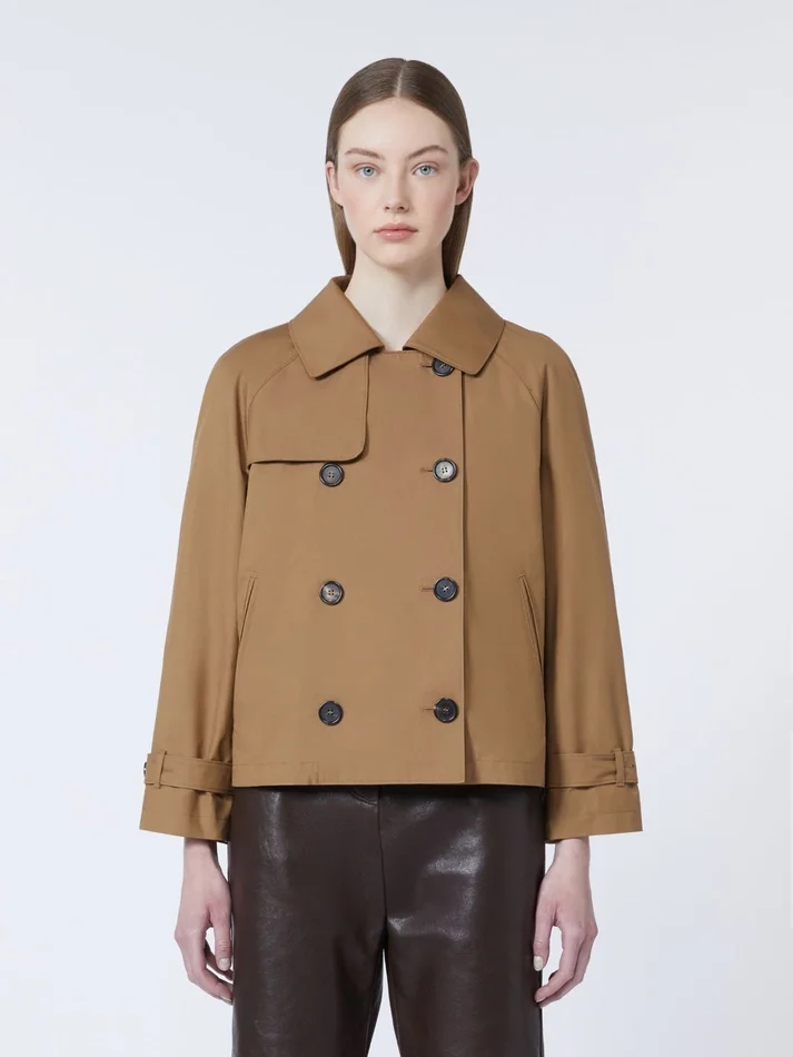 short double-breasted trench coat with buttoned cape on the back, front storm flap on the right-hand side and adjustable cuff straps.