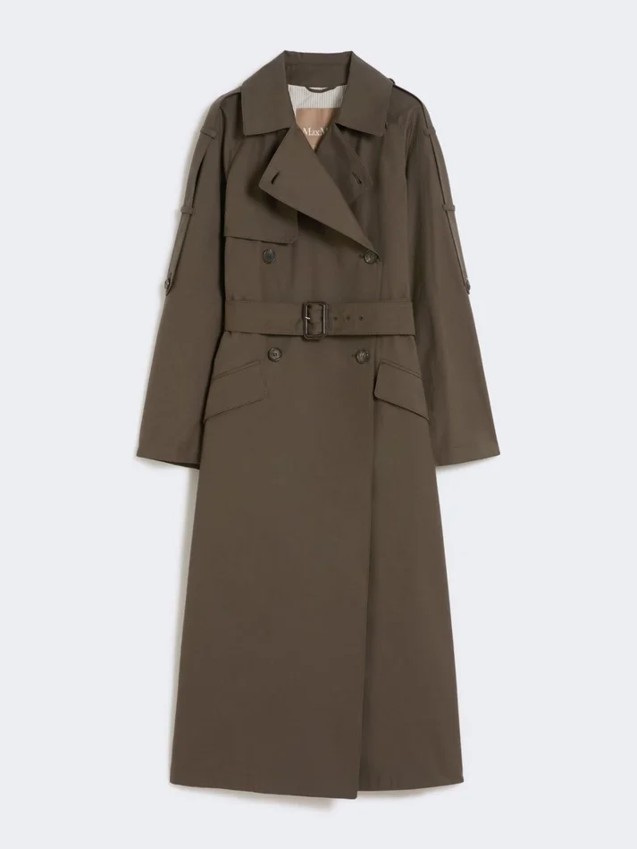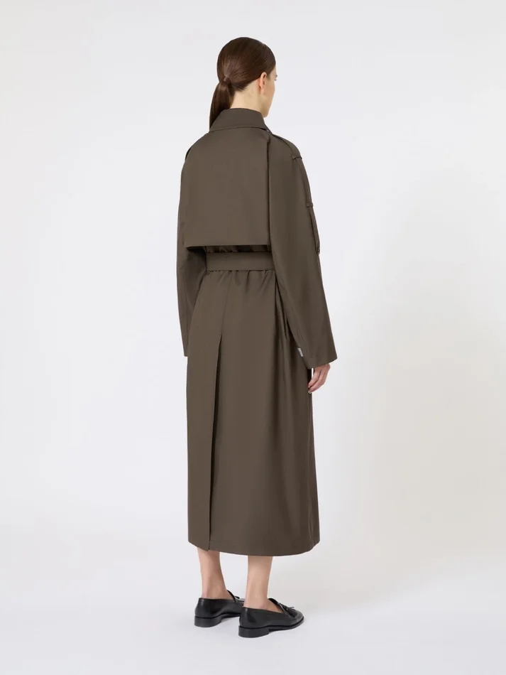 long double-breasted trench coat with tailored stitching, detached yoke and matching belt with embossed logo and leather buckle.