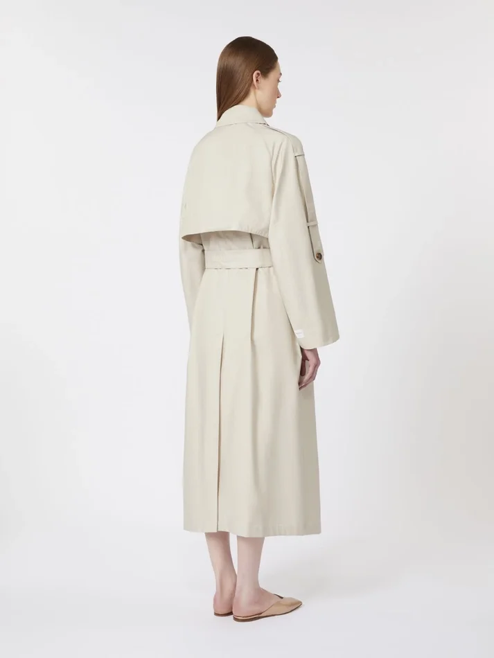 long double-breasted trench coat with tailored stitching, detached yoke and matching belt with embossed logo and leather buckle.