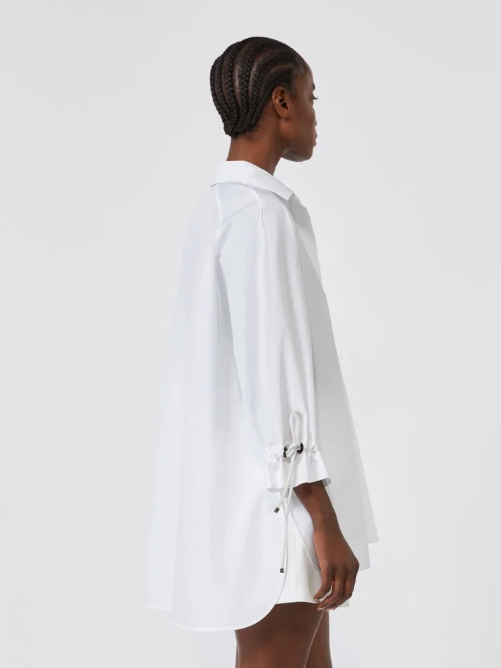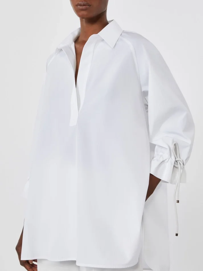 oversized blouse with shirt-style design, featuring tubular leather drawstrings at the cuffs with horn eyelets and metal ends.