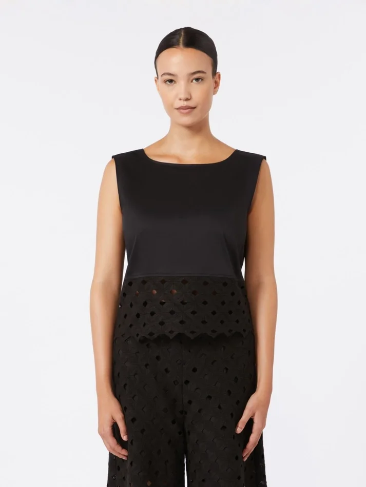sleeveless crop top featuring a geometric macrama lace band at the hem.