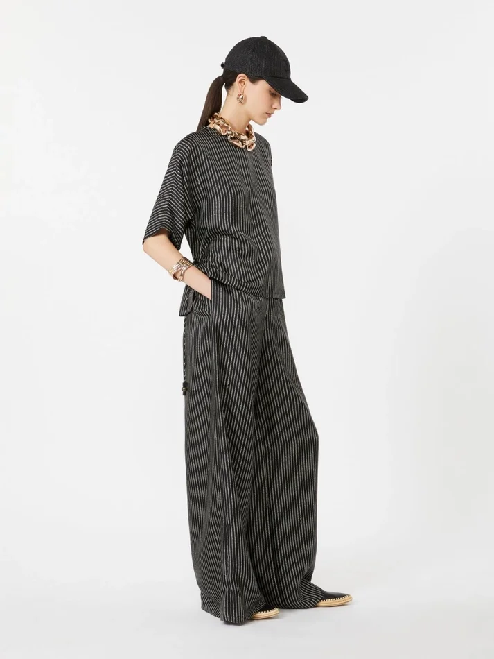 t-shirt-style blouse featuring a rear waist drawstring and tubular side ties, complete with geometric details.
