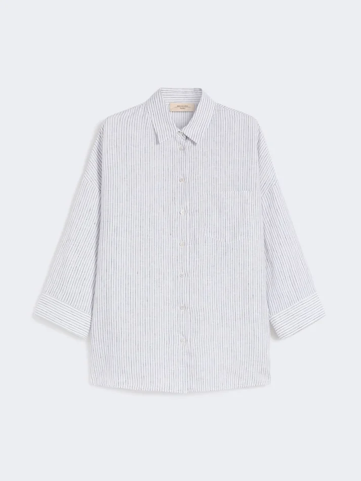 loose-fitting, slightly flared shirt with an all-over printed vertical stripe pattern.