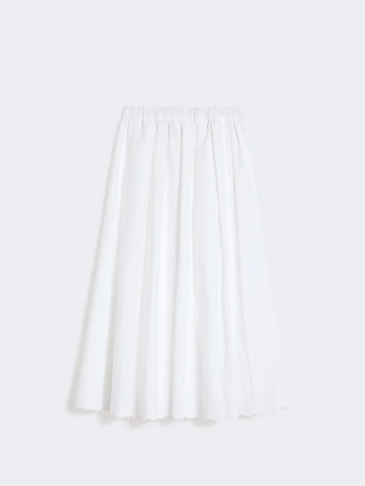 long a-line skirt, embellished with eyelet embroidery on the hem and a scalloped edge.