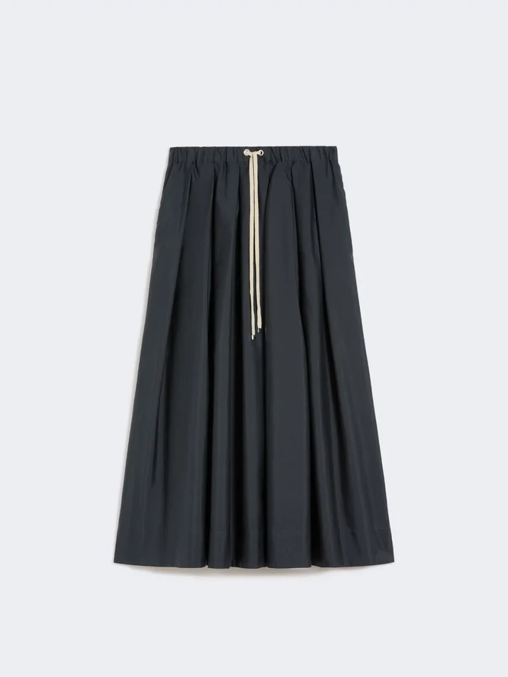 long, a-line skirt with a full volume, elasticated waist and pleated pattern.