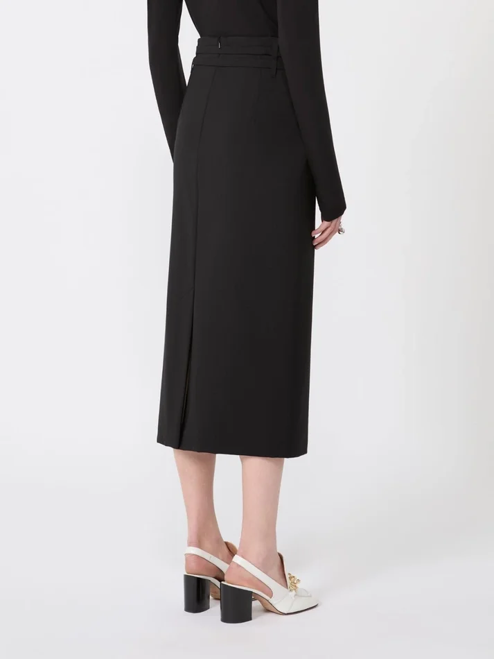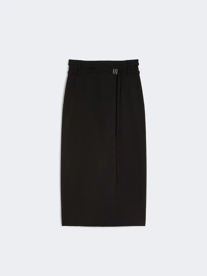 midi skirt with a minimalist line, featuring a slightly high waistline emphasised by the double-wrap belt. the s-shaped metal buckle adds an iconic note. – natural stretch pure wool canvas skirt – high waist with double-wrap belt and s-shaped metal buckle – centre-back slit – topstitched darts at the front and back – fitted waist